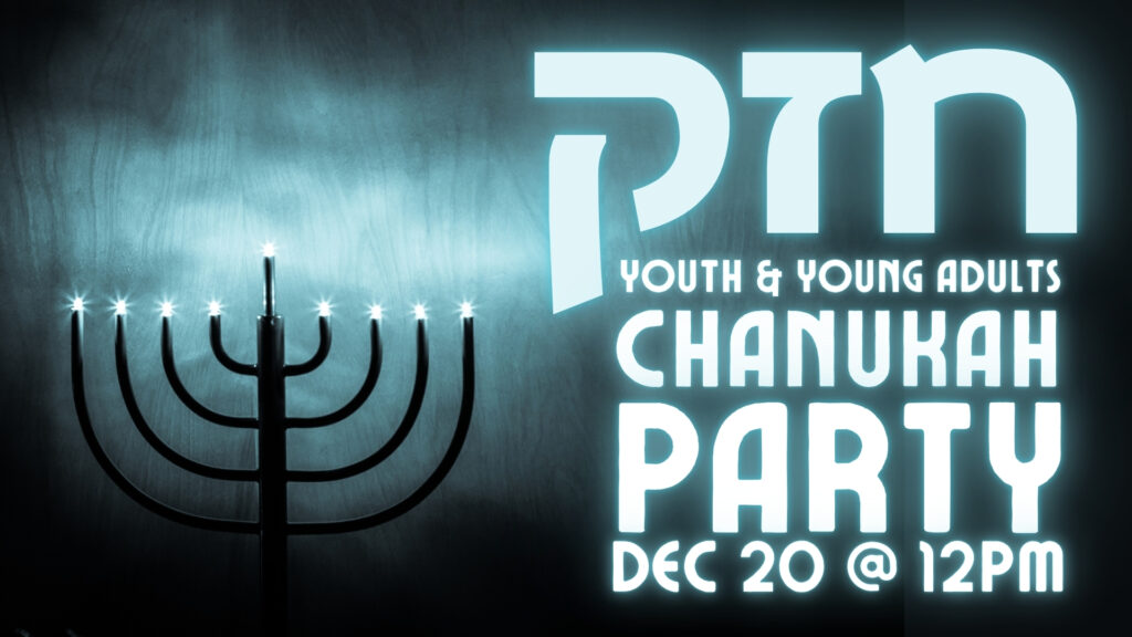 The Chazak Chanukah Party is on Saturday December 20th, right after service. Will there be latkes? Maybe! Will there be sufganiyot? Perhaps! Will there be hilarious times? Most definitely! Make sure you speak with Joe, our Youth & Young Adult Director, to find out what to bring: youth@shalombrevard.com