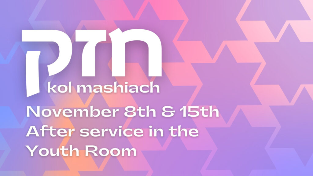 Chazak Shabbats meet November 8th and 25th this month. Grab a bagel from the community room, a drink from the youth room fridge, and get ready for a time of sharing and digging into the word. If you have any questions, email Joe: