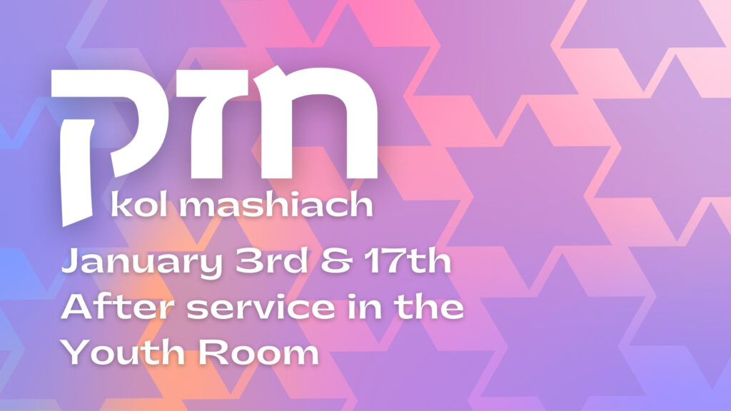 Chazak Shabbat meets January 3rd & 17th this month. Grab a bagel from the community room, a drink from the youth room fridge, and get ready for a time of sharing and digging into the word. If you have any questions, email Joe: youth@shalombrevard.com