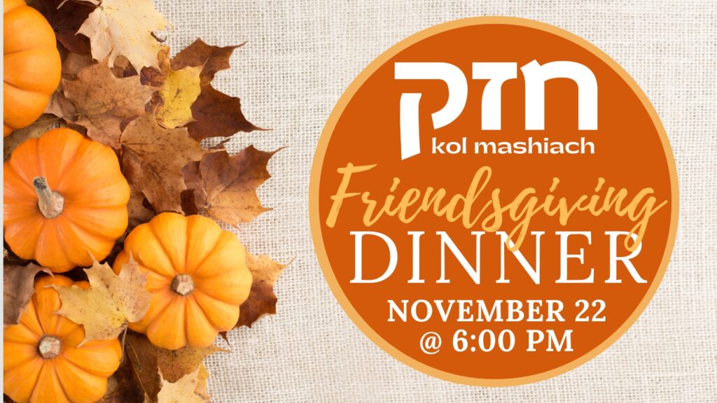 It’s always a fabulous time to celebrate Thanksgiving with friends! Save the date for the Chazak Friendsgiving on Saturday night, November 22nd. Make sure you speak with Joe, our Youth & Young Adult Director, to find out what to bring. For more information email Joe at youth@shalombrevard.com